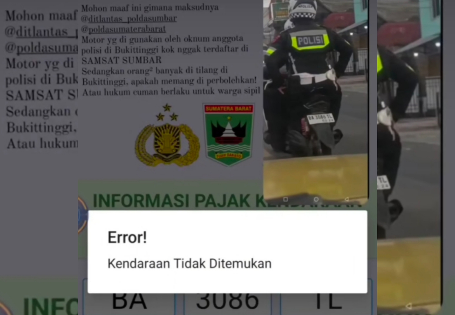 Belakangan ini, ada dugaan penggunaan motor oleh anggota polisi Satlantas yang melakukan penilangan terhadap warga dengan menggunakan plat nomor tidak terdaftar. Dalam video yang diunggah oleh akun @warga_bukittinggi, terlihat dua anggota Satlantas Polresta Bukittinggi mengendarai sepeda motor dengan helm putih dan plat polisi BA 3086 TL.